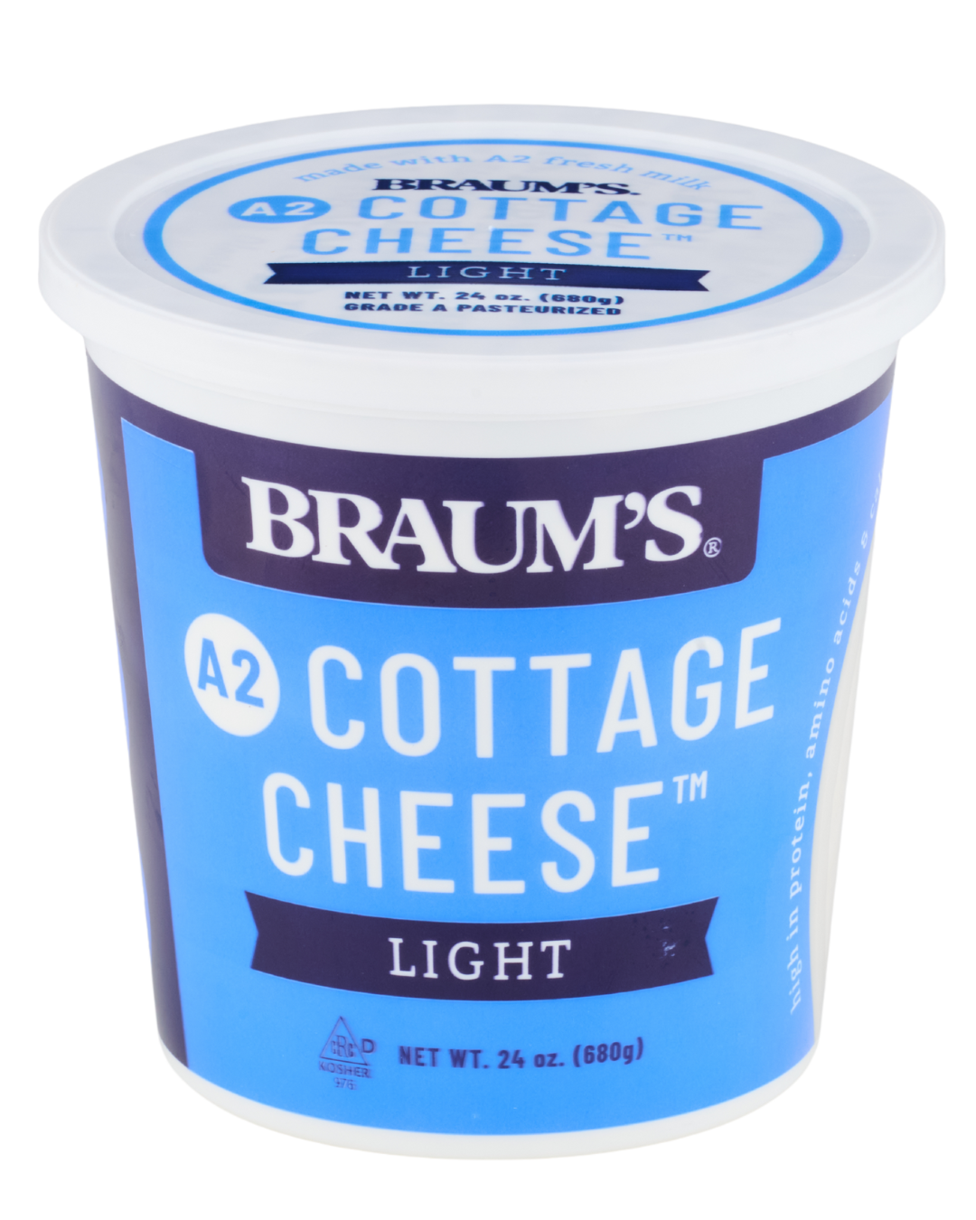 Braum’s A2 Low Fat Small Curd Cottage Cheese has 60 percent less fat than our Regular Cottage Cheese but has the same fresh, wholesome taste! Braum’s Cottage Cheese, made with Braum’s A2 Fresh milk, fresh from the family farm, comes in Low Fat and Regular and is available 24 oz. (Nutritional Facts Below for Light Cottage Cheese.)