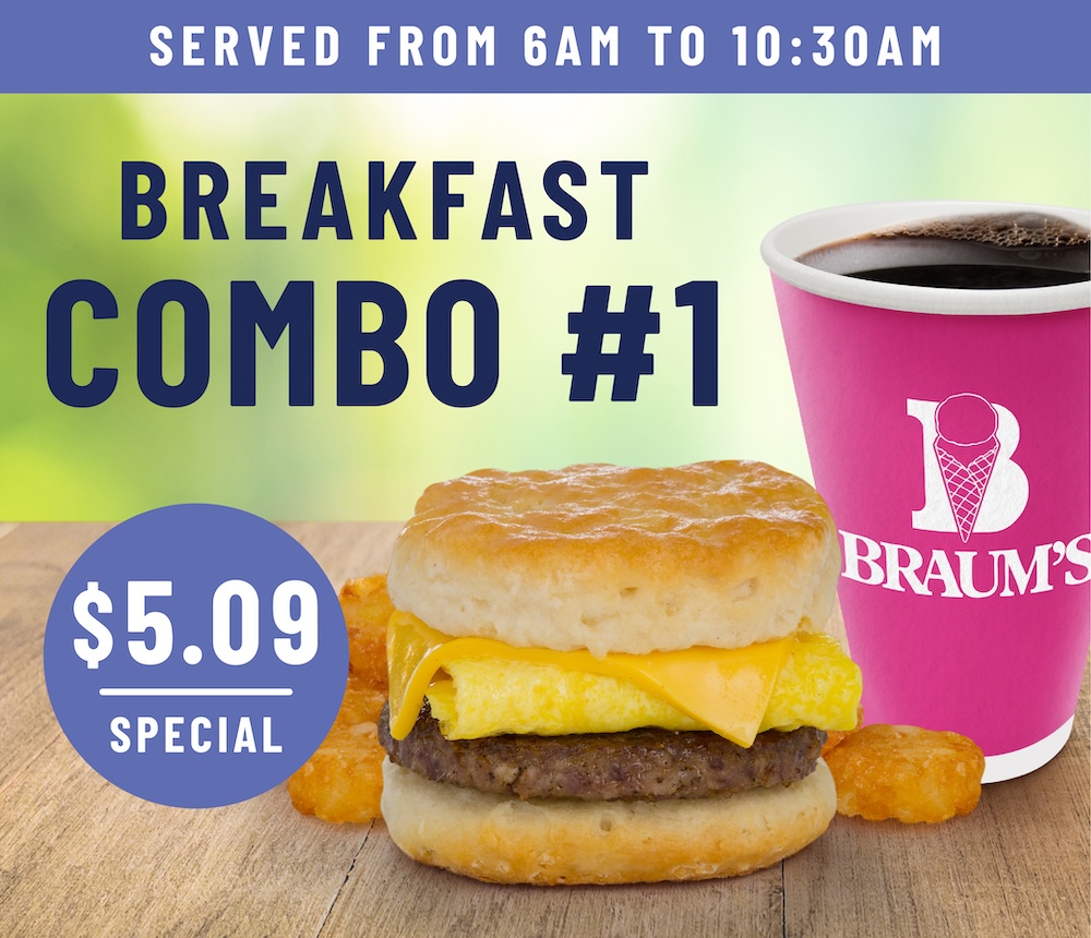 Come have breakfast at Braum’s and enjoy our Sausage, Egg & Cheese Biscuit Combo Special. Available from 6a-1030a! Special pricing for a limited time only – $5.09!